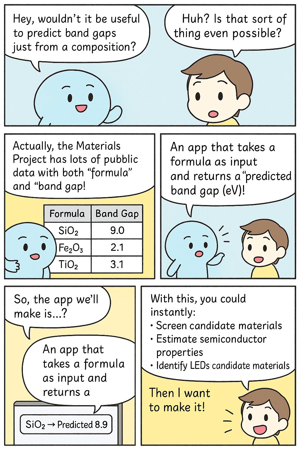 完全な構造(structure オブジェクト)を扱う本格的ML ではないが、「結晶の大まかな指標」から band_gap を予測するライトな構造予測アプリ とする。